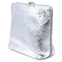 Real Italian leather in a beautiful and elegant cross body bag. Outer zipped pocket and inner zipped pocket keeps this bag neat, tidy and practical.  Metallic silver finish makes it a perfect evening bag.