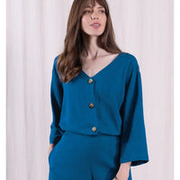 Elevate your wardrobe with this versatile linen blend shirt jacket in Neptune. The 3/4 sleeves, flattering v-neck, and classic button front create a polished silhouette that transitions seamlessly from day to night. Crafted from breathable linen blend fabric, it's designed for comfort without compromising on style. Pair it with matching trousers for a sophisticated coordinated look, or throw it over jeans for casual elegance. Whether you're dressing for the office, a weekend outing, or an evening out, this jacket top delivers effortless style and endless outfit possibilities.