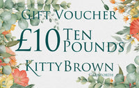 £10 Kitty Brown Boutique Gift Voucher. Can be used against any product in Kitty Brown Boutique's shop. This voucher cannot be used for online purchases. Our gift vouchers have no expiry date.