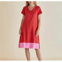 The Elwood Oversized Linen Blend Dress pairs red with striking pink contrast trim for effortless style. Featuring a V-neckline, short sleeves, and side splits, this relaxed silhouette moves beautifully. Practical pockets and a breathable 20% linen, 80% viscose blend complete the look. True to size with an intentionally oversized fit.