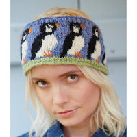 Pachamama Circus of Puffins headband. With a charming puffin design with beaded detail, this headband and ear warmer is 100% wool, fair trade and knitted by hand in Nepal. The fleece lining is warm and soft on the skin.